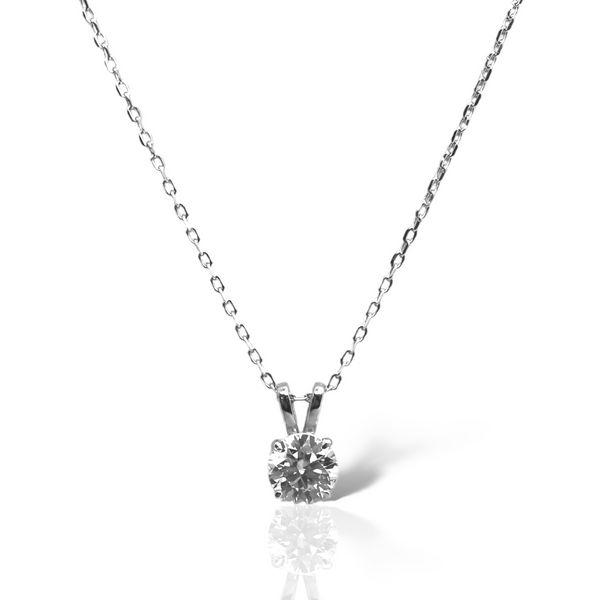 Απλά εκθαμβωτικό! Σας παρουσιάζουμε το κολιέ μας από ασημένιο μωυσανίτη με μια στρογγυλή πασιέντζα κομμένης μπριγιάν κεντρικής πέτρας 1,20 καρατίων (7 χιλιοστά). Αυτό το ευέλικτο κολιέ μπορεί να φορεθεί με κάθε τρόπο, να φορεθεί πάνω ή κάτω και θα είναι το τέλειο αξεσουάρ με όποιο ντύσιμο επιθυμείτε!