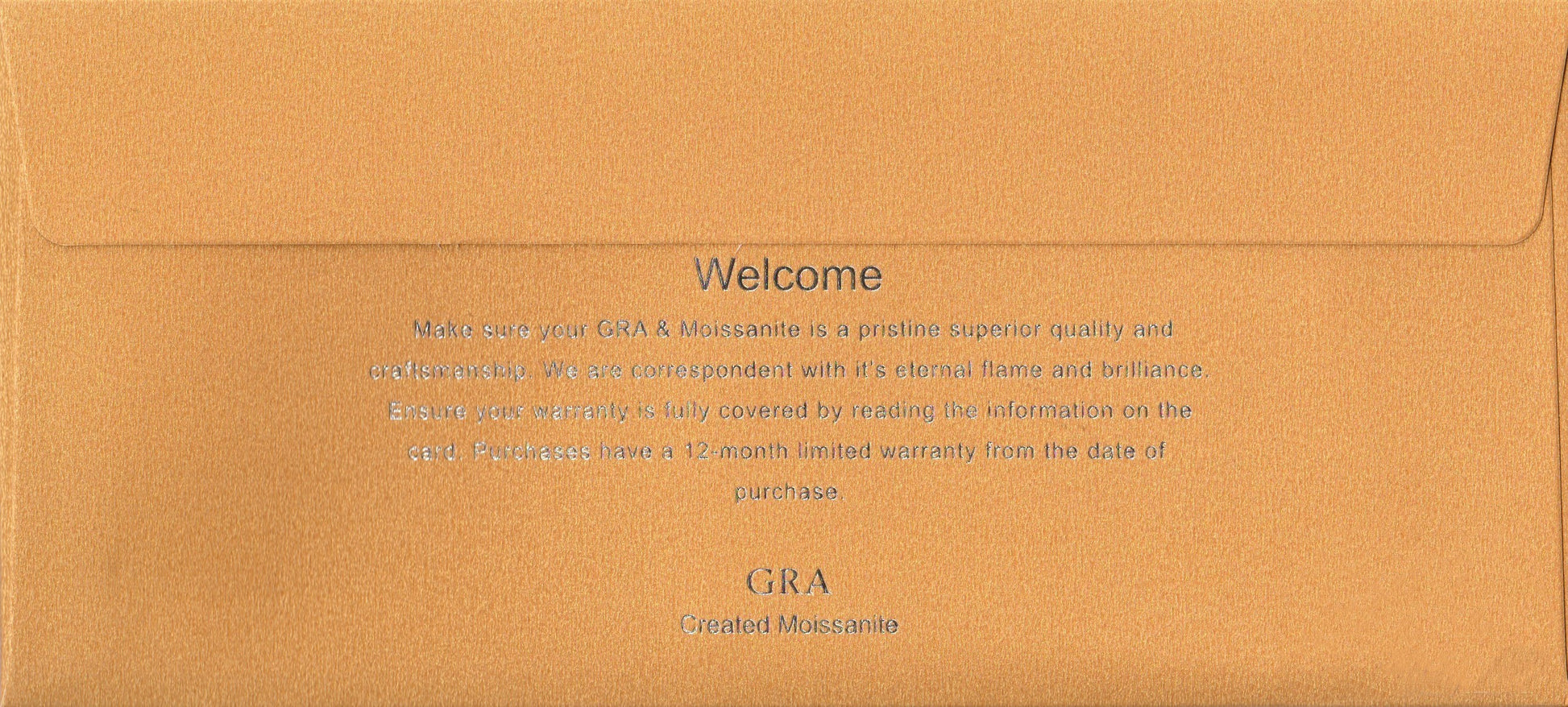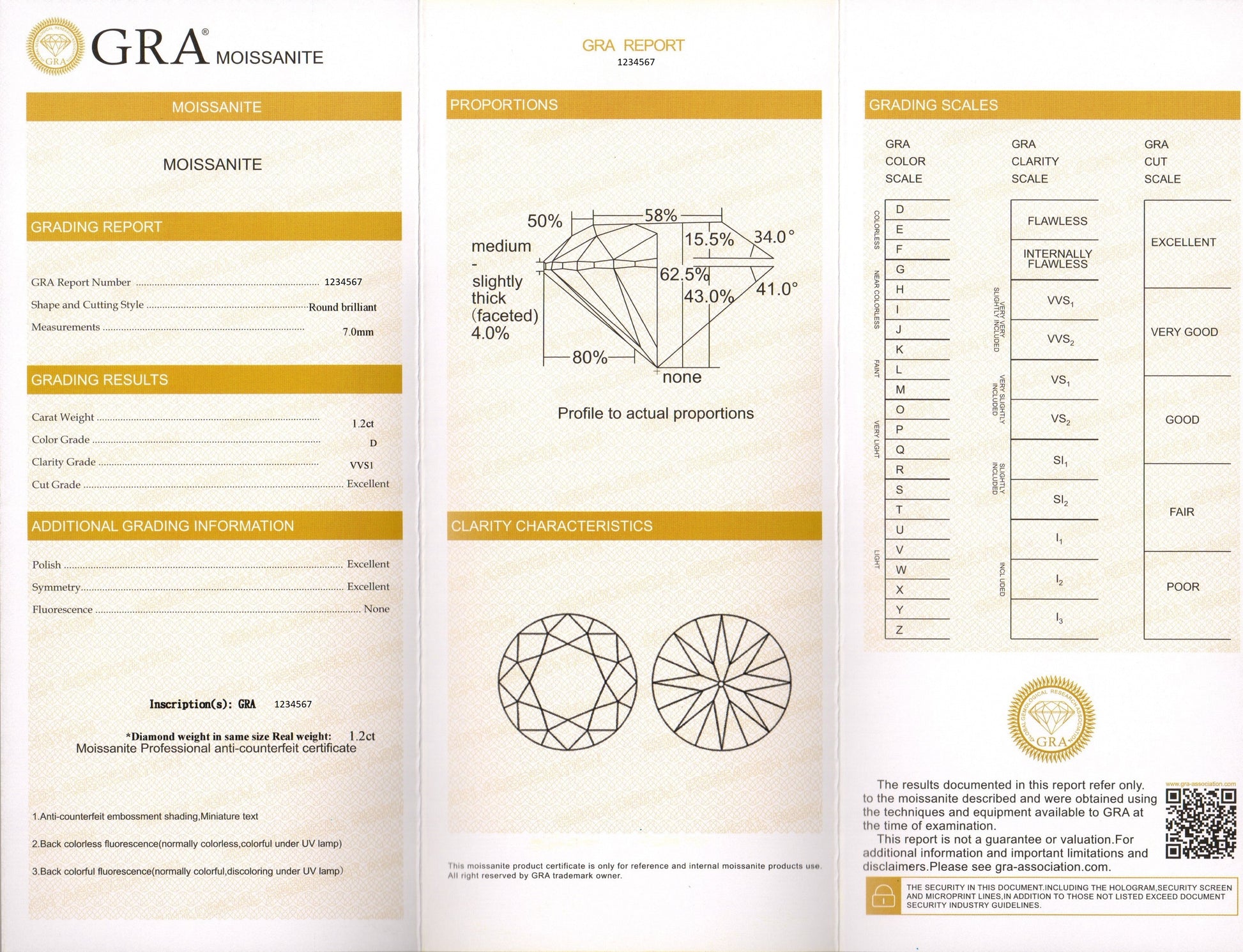 Με την αγορά Moissanite θα χαρείτε να μάθετε ότι θα λάβετε επίσης έναν φάκελο που θα περιέχει την έκθεση Moissanite GRA (Global Gemological Research Association) για το συγκεκριμένο Moissanite . Η έκθεση GRA Moissanite παρέχει τεκμηρίωση των χαρακτηριστικών και της αυθεντικότητας της πέτρας.
