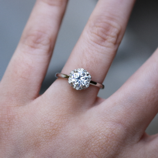 Sterling Silver Moissanite Engagement Ring featuring 0.80ct (6.0mm) Round Brilliant Cut Center Stone with Round Halo