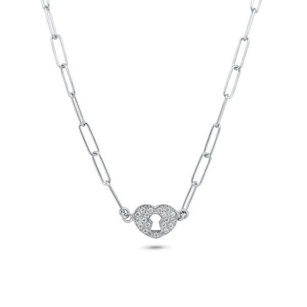 Sterling Silver 925 Paperclip Heart Lock Adjustable Clear CZ Pendant Necklace - SSLPN034