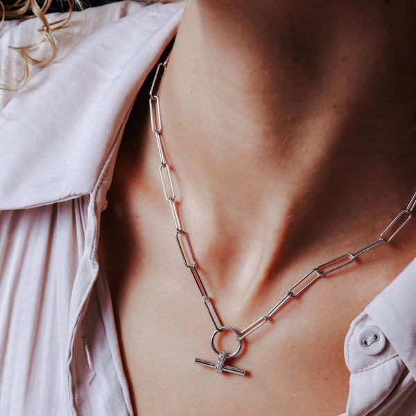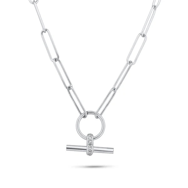 Introducing our elegant Silver 925 Rhodium Plated Paperclip Adjustable Clear CZ Toggle Charm Bar Necklace. This necklace combines modern design elements with timeless sophistication to create a captivating accessory.